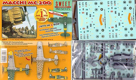 SWEET 1/144 Macchi MC.200. 2 kits in a box; molded in gray plastic. It comes with Three types of clear canopy parts.@Petite model with Exquisite detail, recessed panel lines and rivets. (The best molding ever in this scale) Optional parts; detailed bombs on under wing bomb racks. High Quality decal, printed by CARTOGRAF in Italy, provides the choices 6 different aircraft.