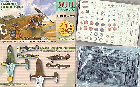 SWEET 1/144 Hurricane Mk.I, Original Fabric Covered Wing. 2 kits in a box, one molded in gray and the other molded in clear plastic!! Petite model with Exquisite detail, recessed panel lines and rivets. (The best molding ever in this scale) Optional parts for Kidney type exhaust pipes and Rolls-Royce exhaust pipes, Watts 2 blade propellers and Dehaviland 3 blades propellers. High Quality decal, printed by CARTOGRAF in Italy, provides the choices for 8 different aircraft. RAF, Belgium, Finnish and Rumanian Air force markings with painting instruction in English.