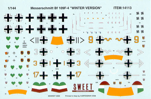 High Quality decal, printed by CARTOGRAF in Italy, provides the choices of 8 winter camouflage markings; aircraft from JG54, JG5, JG53 and Hungarian Air Force.