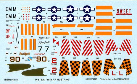 High Quality decal, printed by CARTOGRAF in Italy, provides the choices of 4 Aircraft markings; a P-51B red striped tail from 31st FG, a P-51C yellow tail from 52nd FG, a P-51C "Red tail" Tuskegee airman from 322nd FG, a P-51B Yellow Checker from 325th FG.
