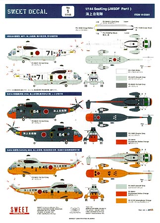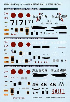#14-D001 Description Snap-Tight kit; The new, Snap-Tight kit of 1/144 scale H-3 Sea King Helicopter. The snap-tight kit consist of 17 white injection plastic parts and 2 optional clear parts for different nose section. All panel lines and window frames are recessed. Model Lengh: 6 & 1/4" when it's built. Decal Sheet; The decal depicts 3 aircraft markings from Japanese maritime Self Defense Force; HSS-2A (Ship Borne Type,) S-61A-1(Antarctic Research Expedition,) S-61A (Rescue Type.) High quality decal printed in Italy by CARTOGRAF.